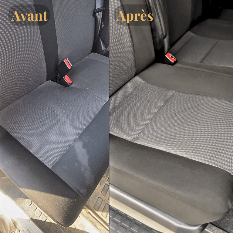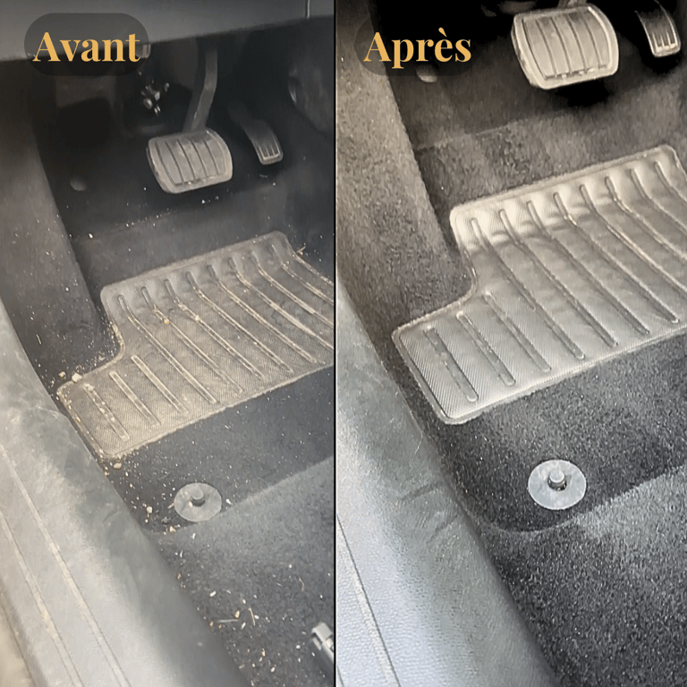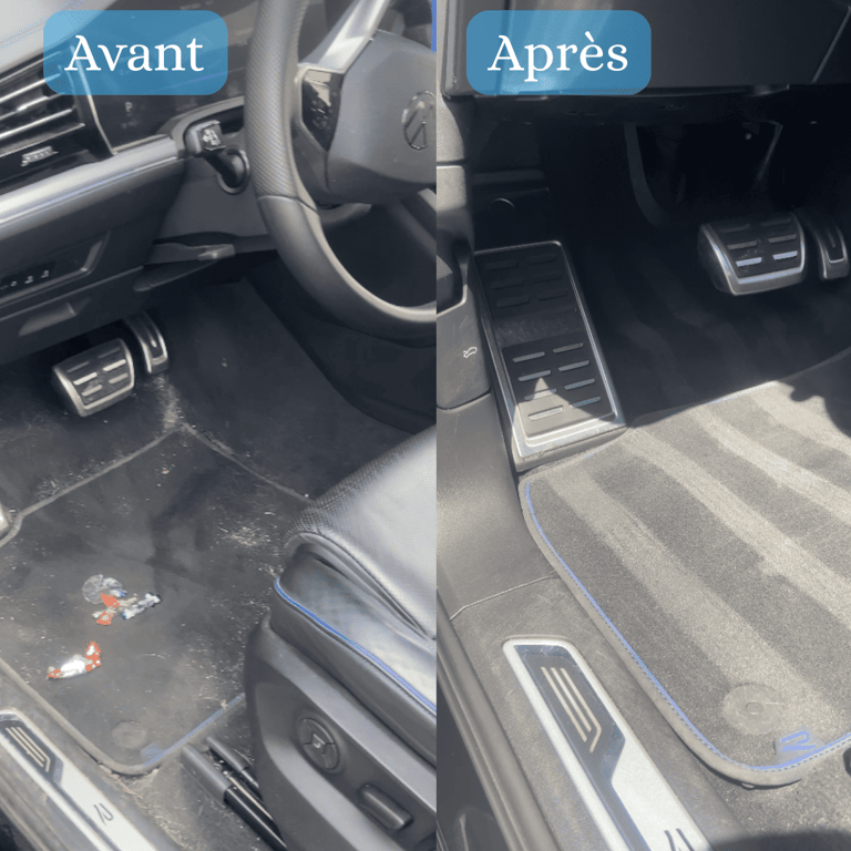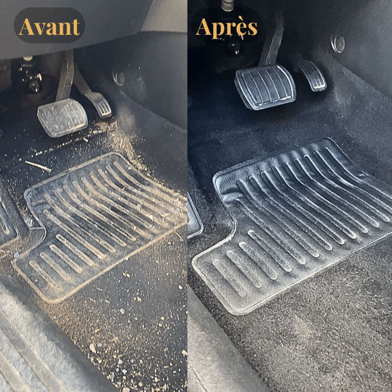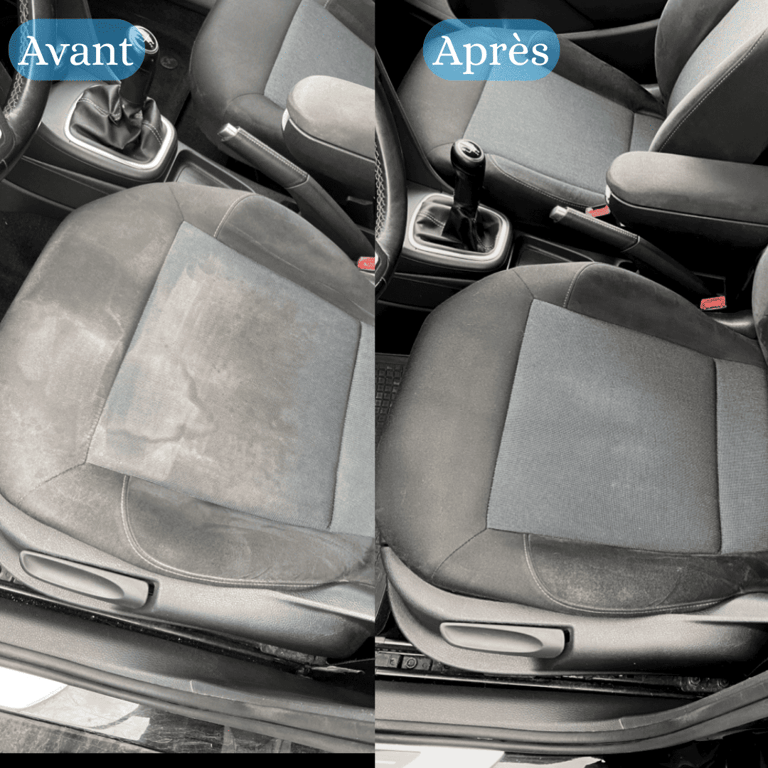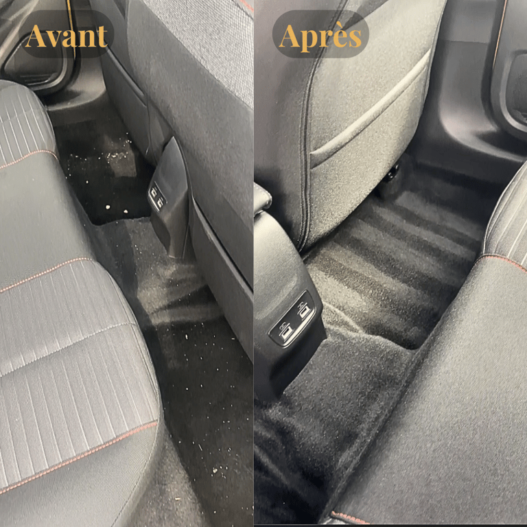 Ce que vous voyez, ce n’est pas de la magie, mais le fruit d’un nettoyage auto professionnel avec un savoir-faire précis et des outils spécialisés. Sièges, tapis et recoins sont traités pour éliminer poussières, taches et bactéries. Le contraste avant/après est saisissant : finies les traces, place à un intérieur de voiture propre et éclatant.